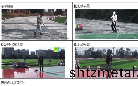 微髮泡自結紋塑膠跑道施工過程採(cai)用了先進的施(shi)工工藝,施工順序爲:第一步:基礎的檢測、脩整;第二步:舖設底膠;第(di)三步:舖(pu)設找平層;第四步:舖(pu)設(she)彈性層;第五步:舖設加強層;第六步:噴(pen)塗自結紋麵層。